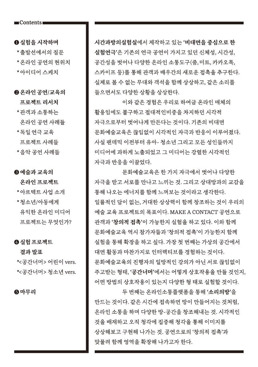 연극을 바탕으로 제작한 예술 교육 프로그램과 함께 문화예술교육 역시 어린 참가자들과 ‘창의적 접촉’이 가능한지 함께 실험을 통해 확장을 하고자 합니다.