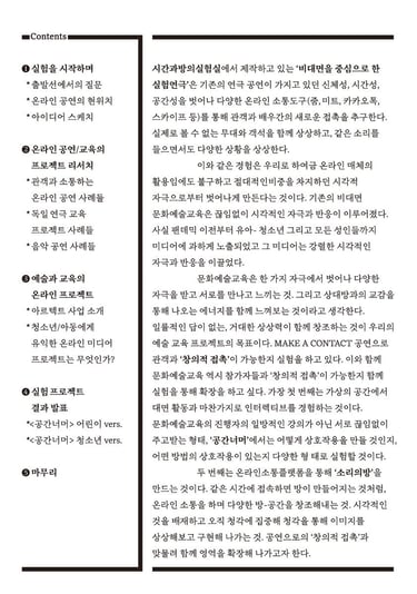 이와 같은 경험은 우리로 하여금 온라인 매체의 활용임에도 불구하고 절대적인비중을 차지하던 시각적 자극으로부터 벗어나게 이끌어 줍니다. 기존의 비대면 문화예술교육은 끊임없이 시각적인 자극과 반응이 이루어졌습니다. 사실 팬데믹 이전부터 유아- 청소년 그리고 모든 성인들까지 미디어에 과하게 노출되었고 그 미디어는 강렬한 시각적인 자극과 반응을 이끌었습니다.