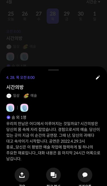 서로의 일상을 살아나가며 음성으로 연결되어 있는 이 음(mm) 플랫폼 안의 소규모 공동체는 서로에 대한 관심으로 10개월의 시간을 유지한 공동체 입니다.