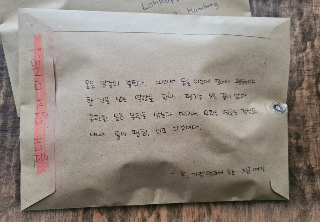 더불어 곧 도래할 메타버스 시대 앞에서 온라인 상에서 마주선 두 인간 존재에 대한 고민을 담았습니다. 우리는 과연 온라인 상에서 함께 공동의 행위를 함으로써, 함께 했다고 말할 수 있는 것인지. 그럼 우리의 만남은 대체 어디에서 일어나고 있는 것인지에 대해 물음을 장난스레 던져 봅니다. 온라인 공연의 특성상, 지역적인 제약을 넘어서 제주도를 포함하여 전국에서 참여가 가능합니다. 더불어 창작자가 거주중인 프랑스와 독일을 비롯하여 유럽 지역에서도 참여가 가능합니다. 유럽 지역 참여자에게도 소품 편지가 발송될 것입니다. 이 작품은 장-뤽 낭시의 "코르푸스", 페터 한트케의 "관객모독" 텍스트에서 영감을 받아 창작되었습니다.