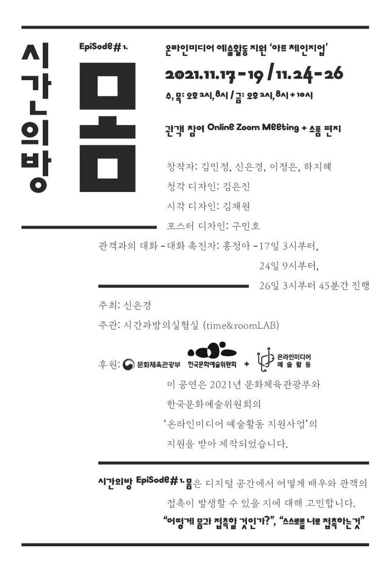 코로나19로 촉발한 온라인 공연의 의미를 다시 쓰며, 현장감에 목말라 있던 관객들의 이야기를 충분히 반영해낸 관객의, 관객을 위한, 관객에 의한 <시간의 방, 몸>의 실험은 코로나19 시대에 망설임 없이 적응해낸 카멜레온과 같은, 2021년 최고의 공연이었다고 감히 말하고 싶습니다! - 아르코 크리에이터 이민지
