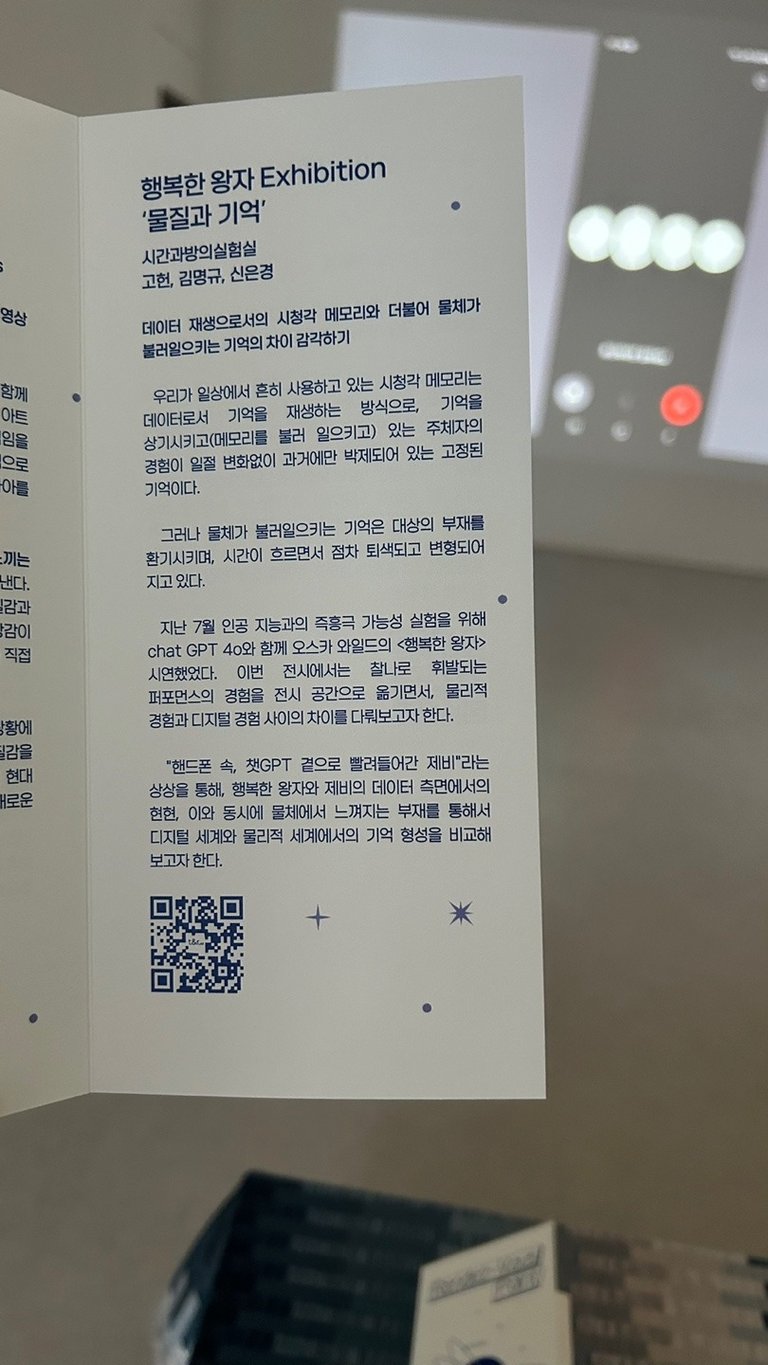 이번 전시는 지난 7월 14일 춘천에서 진행되었던 AI와 인간의 즉흥극 <행복한 왕자> 퍼포먼스를 전시 형식으로 재구성했습니다. 이 과정 안에서 디지털 사회 속 변화된 기억과 접촉의 의미를 탐구합니다. 디지털 기기를 통해 재생되는 데이터로서의 기억과, 실제로 퍼포먼스에서 사용했던 물체를 통해 불러 일으켜지는 생체 기억의 차이를 감각해 보고자 합니다.