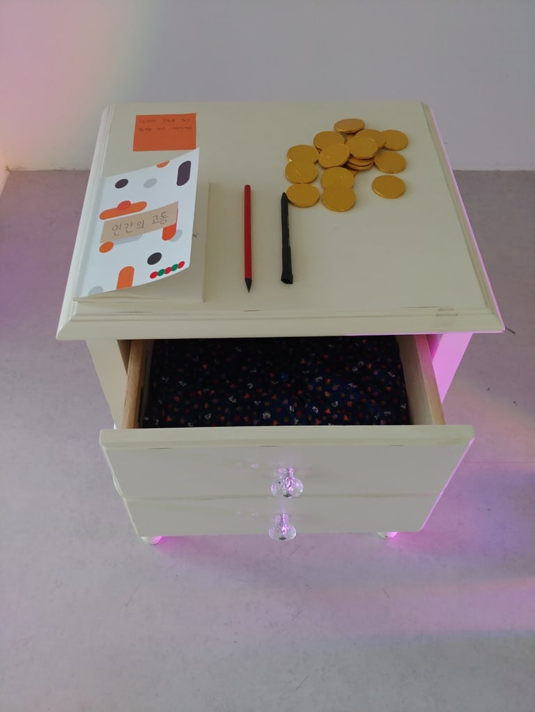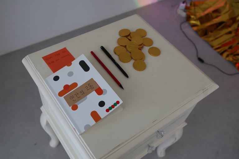 세 번째 파트에서 관람자는 자신의 기억을 떠올립니다. 작은 테이블 위에는 "인간의 고통"이라 이름 붙여진 노트와 볼펜, 금전 초콜릿이 쌓여 있습니다. 관객은 이 노트에 자신의 고통을 기입하고, 금전 초콜릿을 하나 얻어갑니다.
